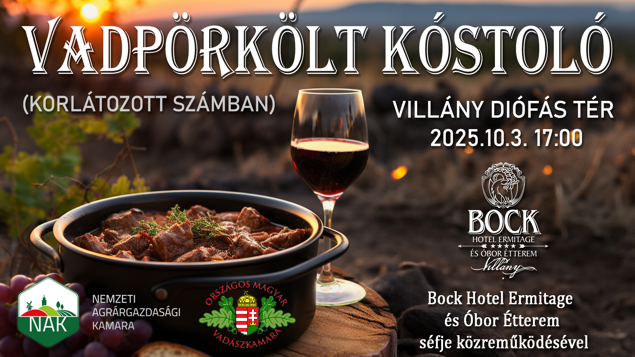 A Nemzeti Agrárgazdasági Kamara támogatásával vadpörkölt kóstoló a Villányi Vörösbor Fesztiválon rendezvényen célunk, hogy felhívjuk a figyelmet a vadhús fogyasztás előnyeire és értékeire, valamint, ösztönözzük a látogatókat a tudatos és felelős fogyasztásra. Köszönjük a partnerséget a Nemzeti Agrárgazdasági Kamara Baranya Vármegyei Szervezetének.